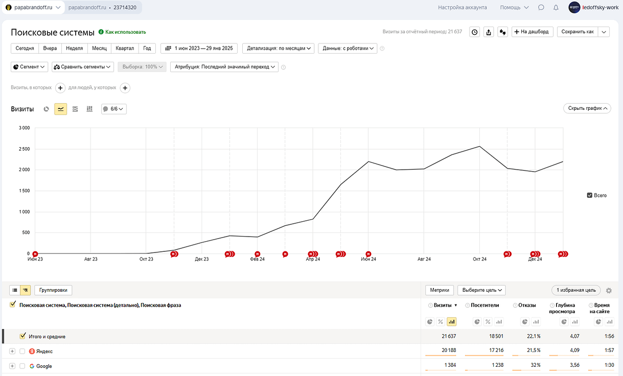 После этих доработок сайт начал показывать уверенный рост, и клиент принял решение приостановить сотрудничество — достигнутый результат оказался для него достаточным на текущем этапе.