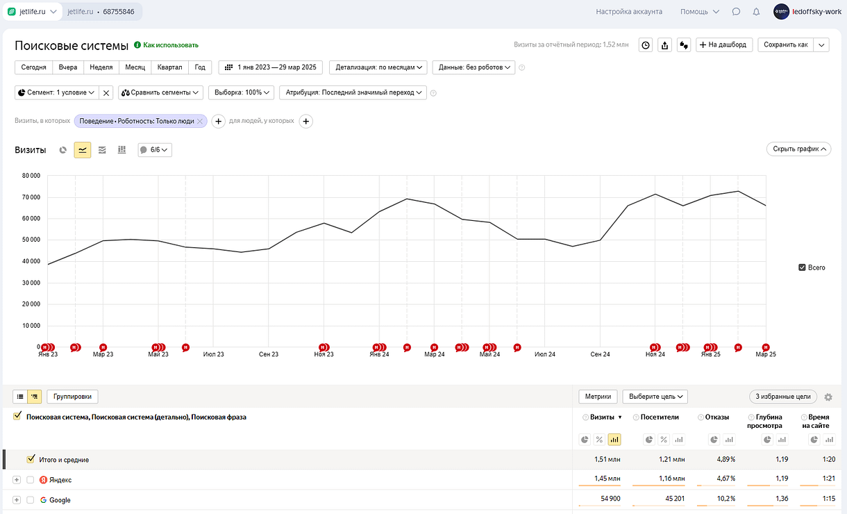 С каждым месяцем объём органического трафика увеличивается.